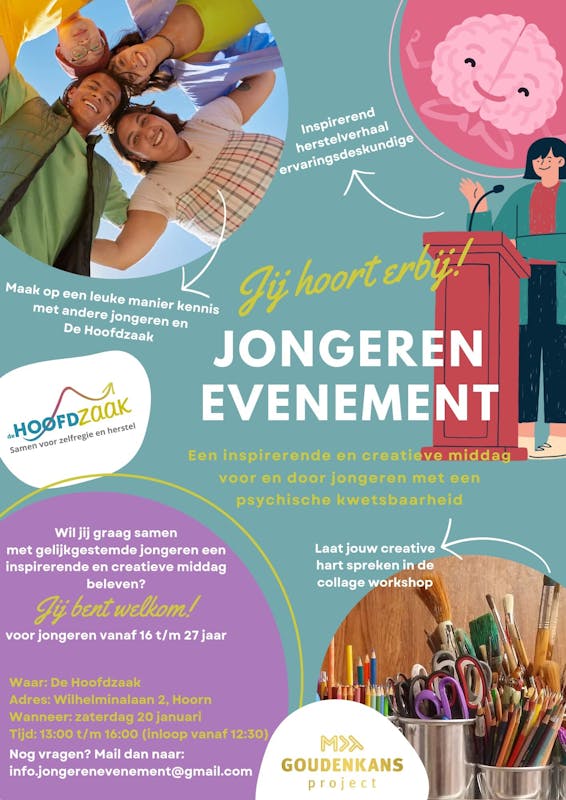 Ben je tussen de 16 en 27 jaar oud, en worstel jij wel eens met psychische problemen? En lijkt het je fijn om in contact te komen met anderen die misschien wel in een vergelijkbare situatie zitten? Kom dan naar ons Jongeren Evenement. We organiseren dit samen met het Gouden Kans project. Het wordt een leuke en inspirerende middag! Meedoen kost niets!