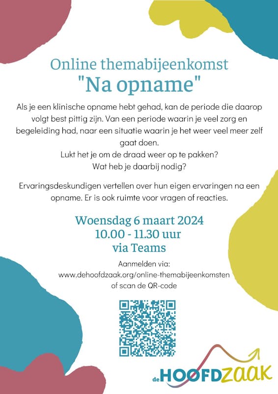 Op woensdag 6 maart 2024 is het thema van onze online themabijeenkomst ‘Na opname’.