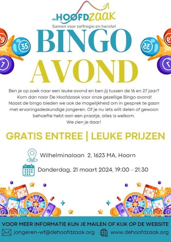 Ben je op zoek naar een leuke avond en ben jij tussen de 16 en 27 jaar? Kom dan naar De Hoofdzaak voor onze gezellige Bingo avond! Naast de bingo bieden we ook de mogelijkheid om in gesprek te gaan met ervaringsdeskundige jongeren. Of je nu iets wilt delen of gewoon behoefte hebt aan een praatje, alles is welkom. We zien je daar