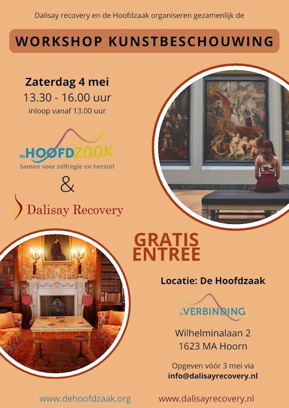 Op zaterdag 4 mei organiseren we samen met Stichting Dalisay Recovery een workshop “Kunstbeschouwing” in De Verbinding.