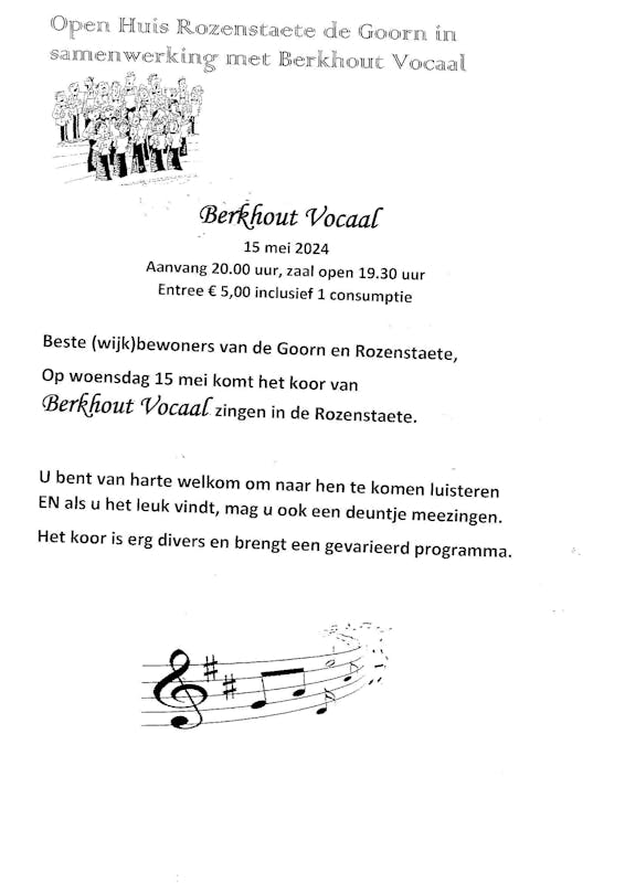 Hou je van muziek en zing je graag, kom dan 15 mei 2024, 19.30 uur naar de Rozenstaete in de Goorn, waar het koor Berkhout Vocaal zal optreden.