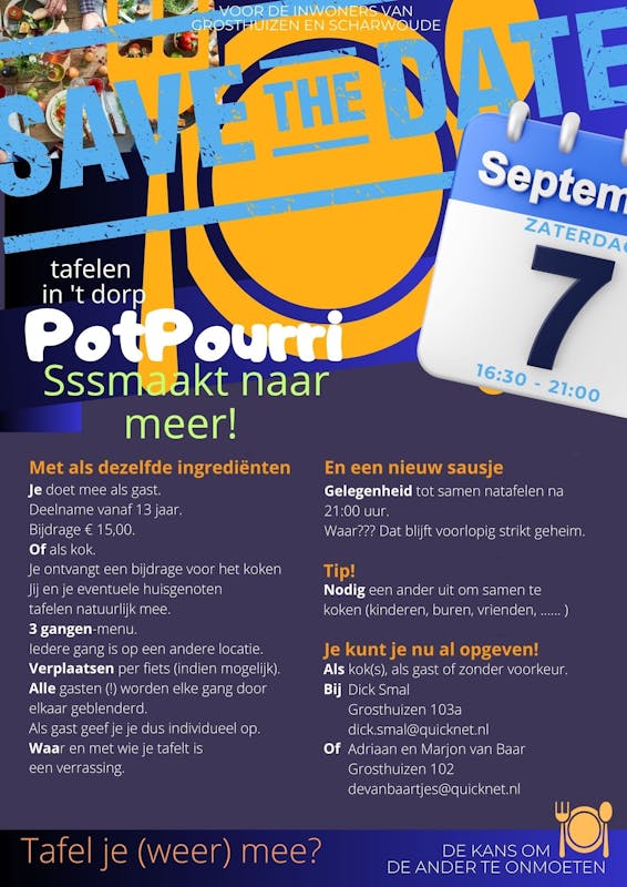 PotPourri - tafelen met dorpsgenoten. Tafel je ook (weer) mee? Na het succes van vorig jaar wordt het zeker weten opnieuw een gezellige en smakelijke Pot. Het is de kans om de ander te ontmoeten.