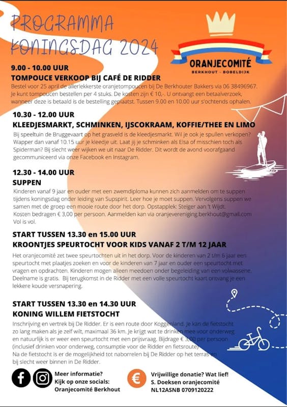 Kinderen vanaf 9 jaar en ouder met een zwemdiploma kunnen zich aanmelden om te suppen Kom tijdens koningsdag onder leiding van Supspirit. Leer hoe je moet suppen. Vervolgens suppen we samen met de groep een mooie route door het dorp. Opstapplek: Steiger aan 't Wijdt.