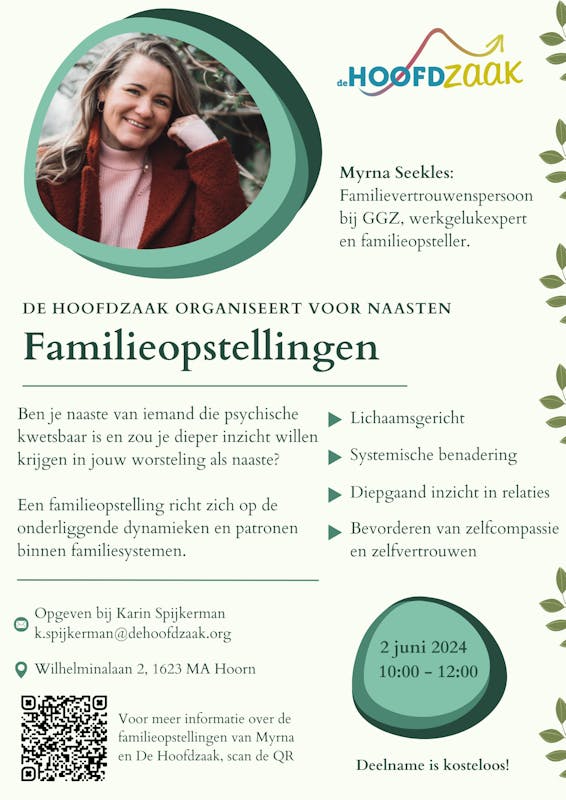 Op zondag 6 juni organiseert De Hoofdzaak ism Myrna Seekling een ochtend familieopstellingen voor naasten van iemand die psychisch kwetsbaar is. Denk hierbij aan ouder, broer/zus, partner.