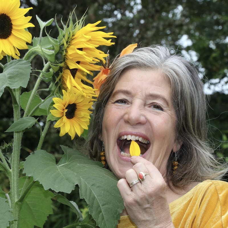 Anna Koster, auteur van twee boeken over eetbare bloemen, heeft een tuin vol met eetbare bloemen en neemt bloemen mee om te proeven.