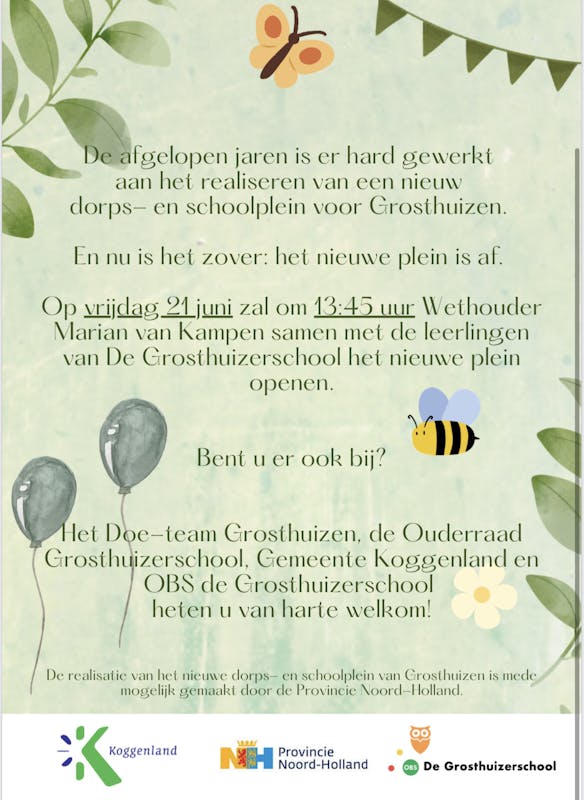 Op vrijdag 21 juni zal om 13:45 uur Wethouder Marian van Kampen samen met de leerlingen van De Grosthuizerschool het nieuwe plein openen.