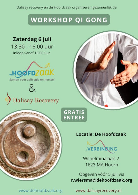 Op zaterdag 6 juli organiseert De Hoofdzaak samen met Dalisay Recovery een workshop “Qi Gong” in De Verbinding.