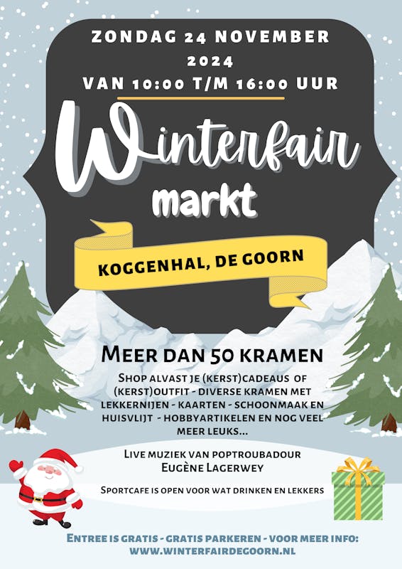 Na het succes van vorig jaar gaan we dit jaar op zondag 24 november van 10.00 tot 16.00 voor een 2de editie van de winterfairmarkt in de Koggenhal. We gaan dit jaar ook groter, meer dan 50 kramen zullen de ruimte vullen. Van huisvlijt tot schoonmaak artikelen, streekproducten, kleding, cadeaus, kerststukjes en nog veel meer leuks. Tussen het shoppen door wordt u weer muzikaal vermaakt door Poptroubadour Eugene Lagerwey.
