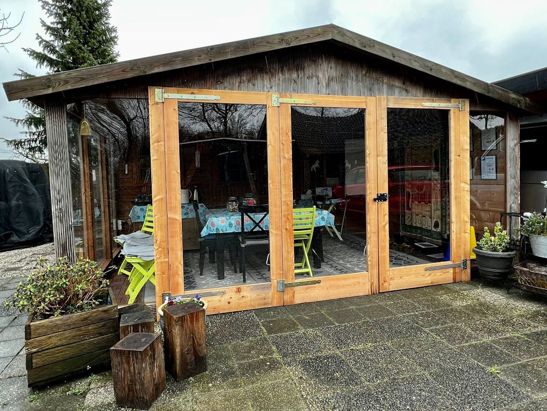 Ontvangst met kop koffie of thee en wat lekkers in de verwarmde blokhut.