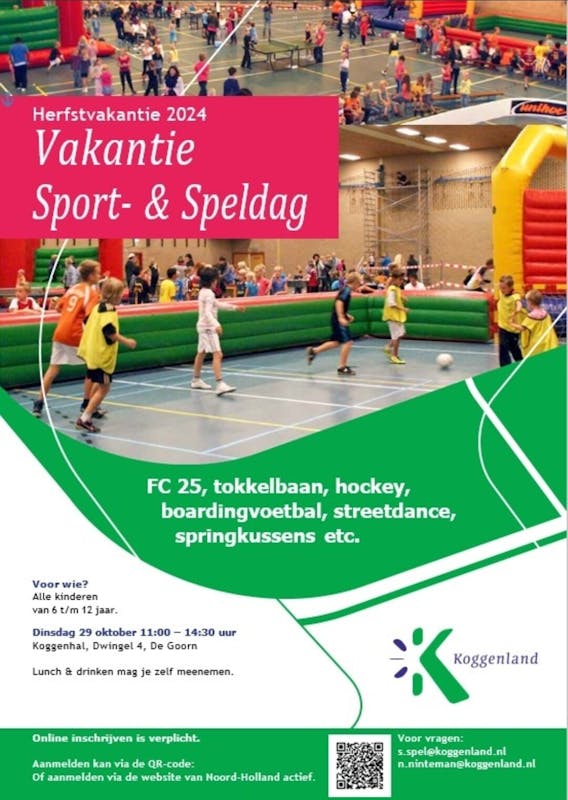 Jongerenwerk Koggenland organiseert op dinsdag 29 oktober een vakantie Sport & Speldag in de Koggenhal te De Goorn. Tijdens dit evenement kunnen kinderen (leeftijdscategorie 6 t/m 12 jaar) uit de hele gemeente allerlei sport- en spelactiviteiten doen in de sporthal.