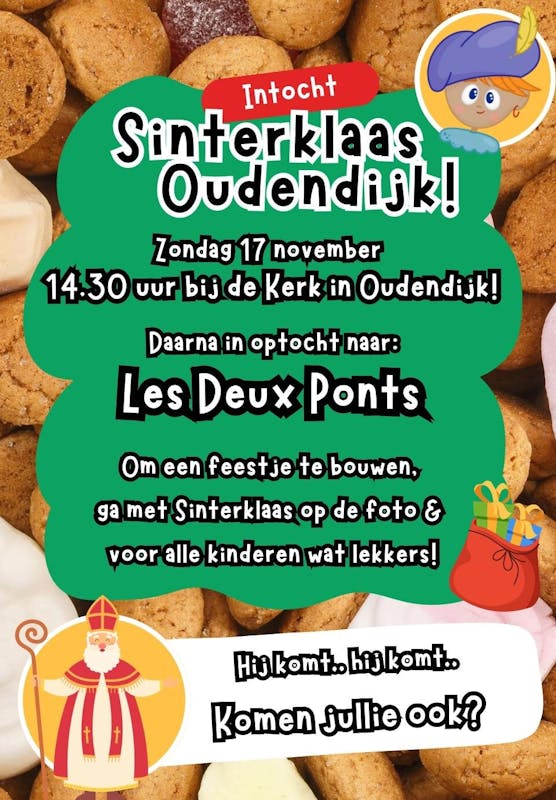 Hij komt, hij komt! Ook dit jaar komt Sinterklaas naar Oudendijk. Hij mag wederom blijven slapen in het Sinthotel! Op zondag 17 november verzamelen wij om 14.30 uur bij de kerk van Oudendijk. Lukt het om Sinterklaas wakker te zingen? Vervolgens gaan we in optocht, onder leiding van Brassband Kunst naar Kracht naar Eetcafe Les Deux Ponts. Samen met de pieten gaan we daar een feestje maken. De kinderen mogen met Sinterklaas op de foto, kunnen samen met de pieten dansen, een cupcake versieren of een mooie kleurplaat inkleuren. Samen maken we er een hele gezellige middag van!