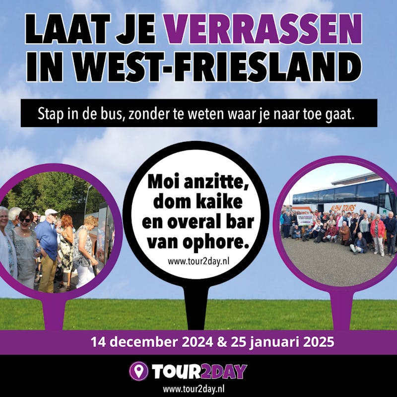 Het idee van deze dag is dat het precieze programma een verrassing blijft. We zullen tijdens deze dag meerdere plekken bezoeken. Dat kan van alles zijn, maar in West-Friesland. Omdat er zoveel leuke activiteiten zijn hebben we een combinatie gemaakt van verschillende locaties in verschillende dorpen. De dag is volledig verzorgd. incl. busreis, koffie, lunch en begeleiding. Vertrek vanaf Hoorn station.