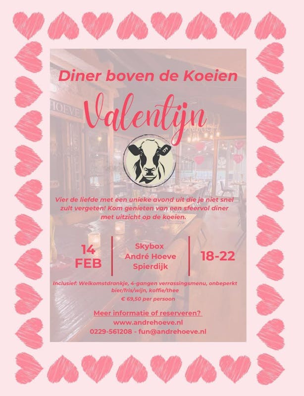 Kom proeven, beleven en genieten op de André Hoeve tijdens ons Valentijnsdag Diner Boven de Koeien! We toveren de skybox met prachtig uitzicht op de koeien om tot pop-up restaurant.