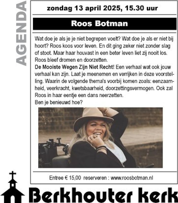 Wat doe je als je je niet begrepen voelt? Wat doe je als er niet bij hoort? Roos koos voor leven. En dit ging zeker niet zonder slag of stoot. Maar haar houvast in een beter leven liet zij nooit los. Roos bleef dromen en doorzetten. De Mooiste Wegen Zijn Niet Recht! Een verhaal wat ook jouw verhaal kan zijn. Laat je meenemen en verrijken in deze voorstel ling. Waarin de volgende thema's voorbij komen zoals: eenzaam heid, veerkracht, kwetsbaarheid, doorzettingsvermogen. Ook zal Roos in haar eentje een dans neerzetten. Ben je benieuwd hoe