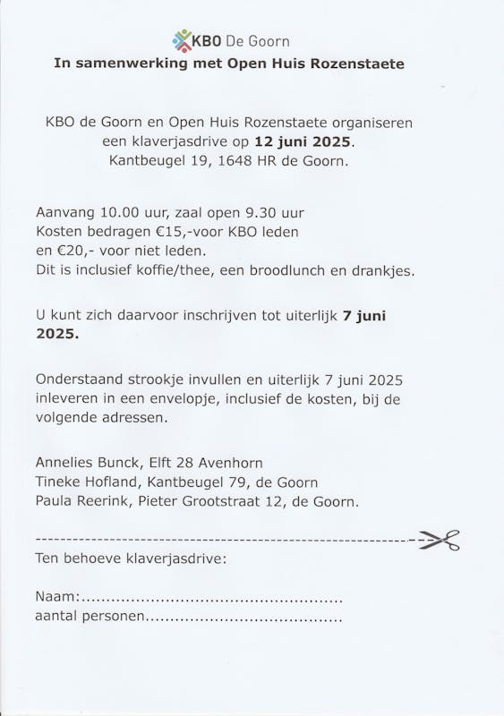 Ben jij een enthousiaste klaverjasser en vind je het leuk om met andere bewoners een leuke dag te hebben, dan hebben wij iets voor je. Het klaverjassen is niet alleen voor de ouderen. Het is een geweldig kaartspel dat, als er geen jongere zich aanmeldt, het op den duur zal verdwijnen.
