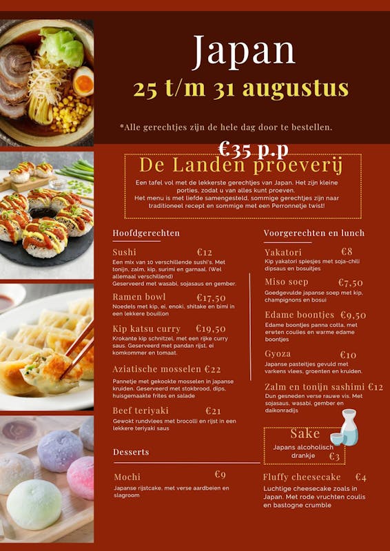 In juli, augustus en september rijd de fictieve trein de wereld rond. Elke week koken wij als aanvulling op onze gewone menukaart heerlijke gerechtjes van over de hele wereld.