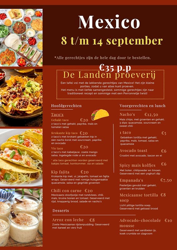 Probeer bijvoorbeeld onze heerlijke taco's met vis, vlees, kip of een vegetarische vulling. Nacho's met huisgemaakte guacamole of chili con carne.