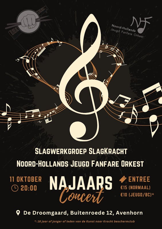 Op zaterdagavond 11 oktober om 20:00 uur geven slagwerkgroep SlagKracht van Muziekvereniging Kunst naar Kracht en het Noord-Hollands Jeugd Fanfare Orkest (NHJFO) samen een najaarsconcert in De Droomgaard in Avenhorn. Beide groepen brengen een afwisselend programma, waarin allerlei muziekstijlen langskomen: van vrolijke melodieën tot grotere werken en thematische muziek.
