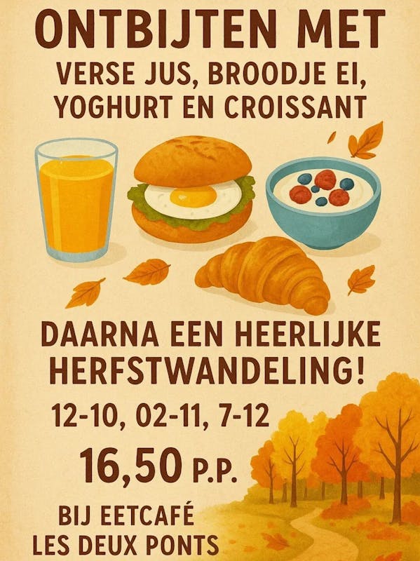 Zin in een goede start van jouw zondag 💪🏻? Kom zondag 12 oktober lekker ontbijten 🍳 en maak daarna een mooie 🍁 herfstwandeling 🍁.