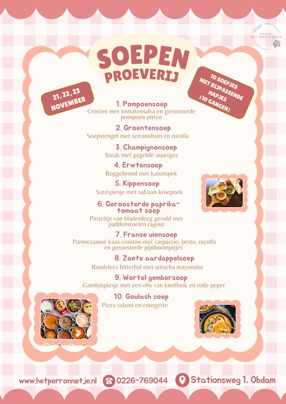 21, 22 en 23 november organiseren wij een soepenproeverij! 10 gangen met verschillende kleine soepjes met bijpassende hapjes.