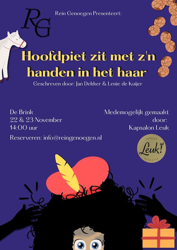 De jaarlijkse Sinterklaas voorstelling van Rein Genoegen! Dit jaar spelen we het stuk 'Hoofdpiet zit met z'n handen in het haar'.