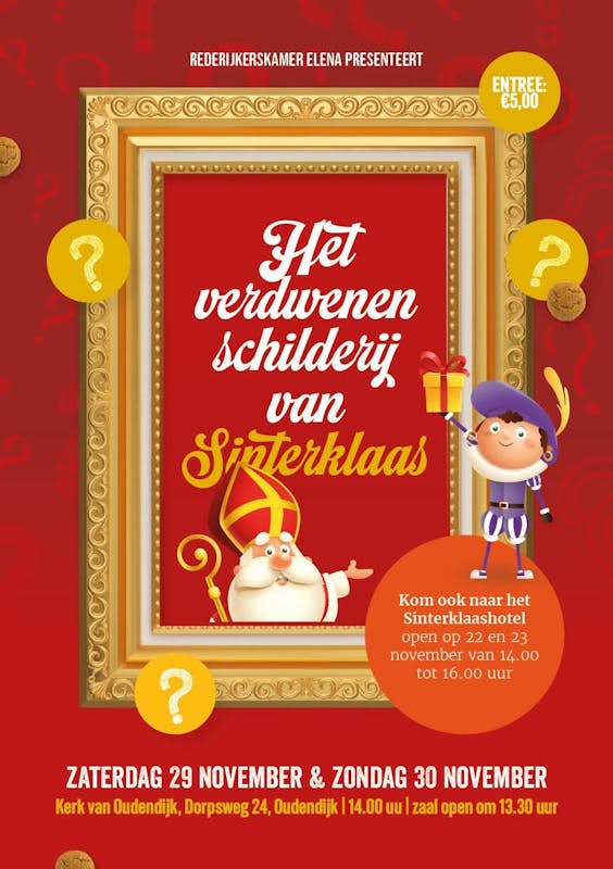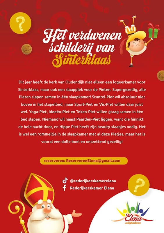 Op 29 en 30 november kunt u in Oudendijk onze Pietenvoorstelling "het verdwenen schilderij van Sinterklaas" bezoeken. Uiteraard met onze Heer Piet en Truus Poets. Maar ook Yoga-Piet, Ideeën-Piet, Sport-Piet, Hippe-Piet en Teken-Piet.