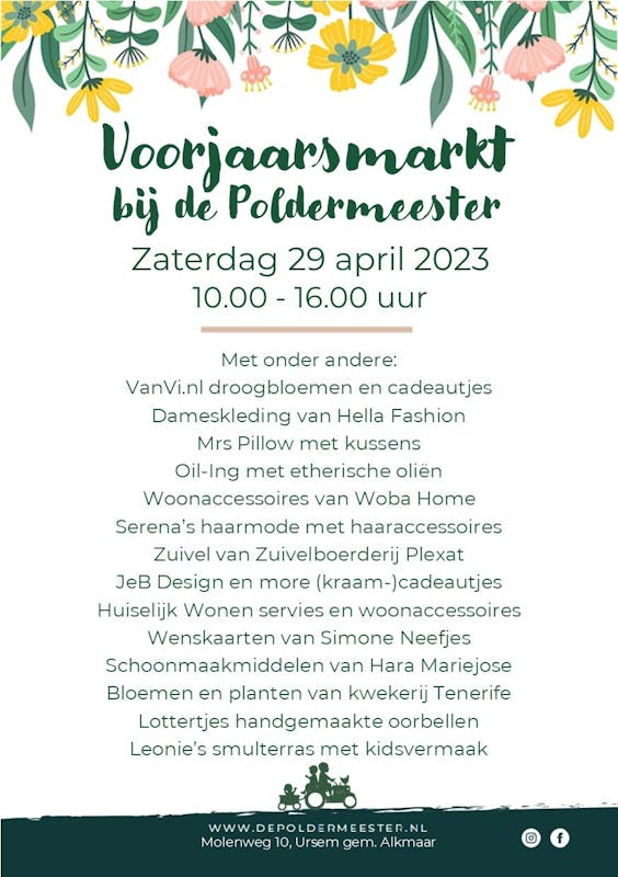 Op het erf van boerderijwinkel De Poldermeester gaan we een echte voorjaarsmarkt organiseren met allerlei lokale ondernemers. Denk aan producten van de boerderij, kleding, droogbloemen, oliën, koffiecorner en nog veel meer...