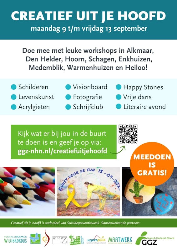 In de week van 9 t/m 13 september organiseert GGZ Noord-Holland-Noord i.s.m. De Hoofdzaak en andere ketenpartners, de suïcidepreventieweek. Hierin vinden gratis creatieve workshops plaats met als thema "creatief uit je hoofd". Hieronder vind je het nieuwsbericht voor meer informatie: