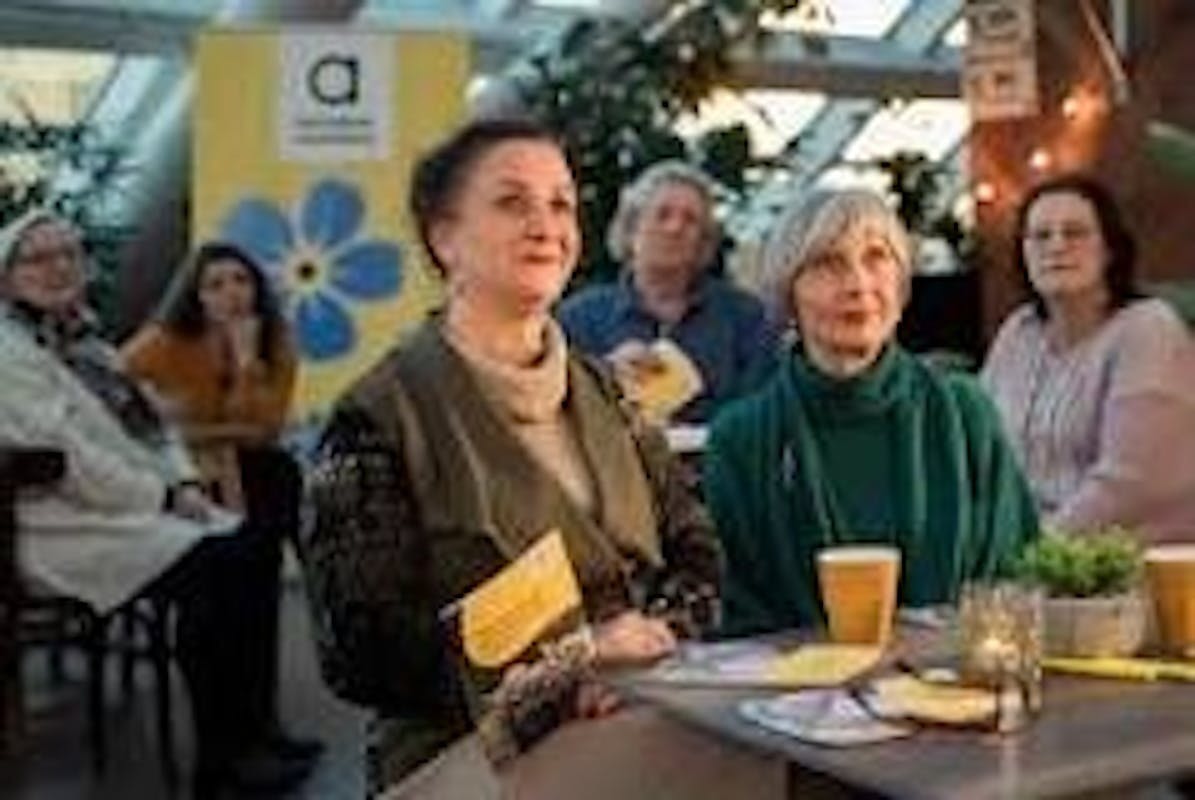 Angelique Vlaar, werkzaam bij JonkersZorg in Hoogwoud, gaat in gesprek met een casemanager van Geriant + de gespreksleider en een deelnemer van een lotgenotengroep in West-Friesland.