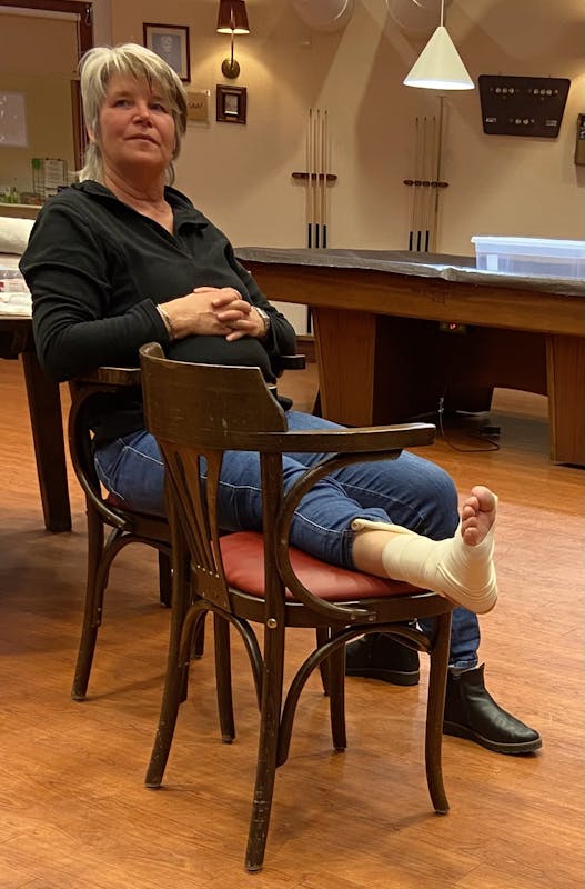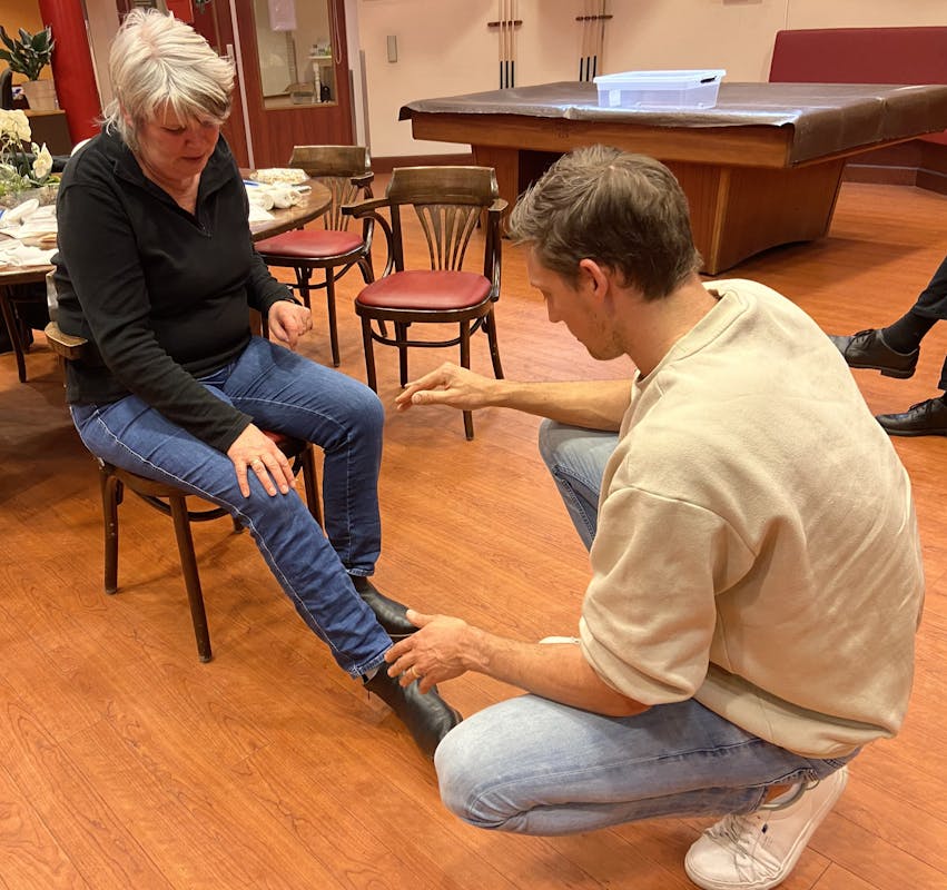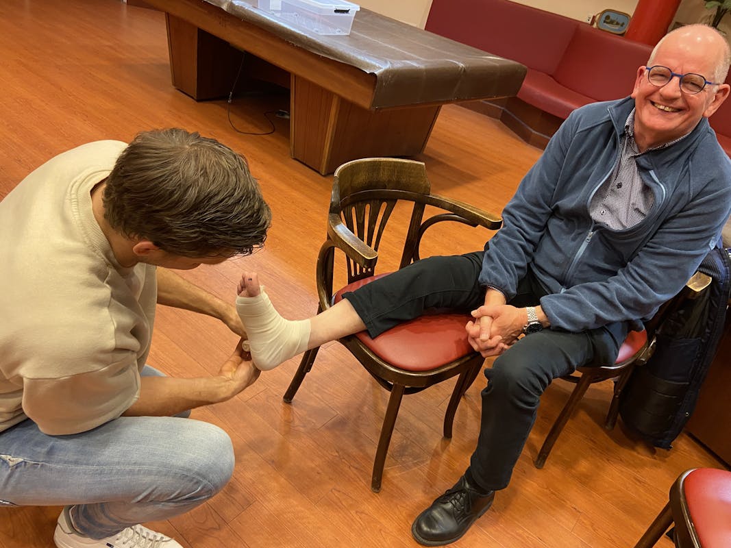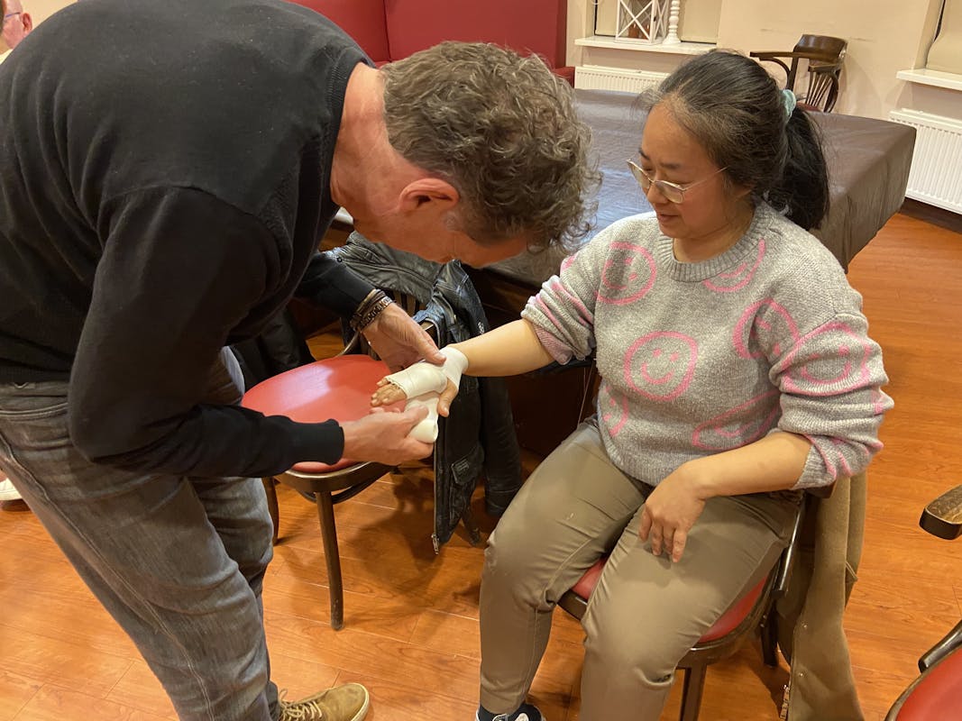 Tijdens de basiscursus EHBO zijn de cursisten volop aan het oefenen met een LOTUS slachtoffer om het geleerde straks in de praktijk te kunnen brengen.