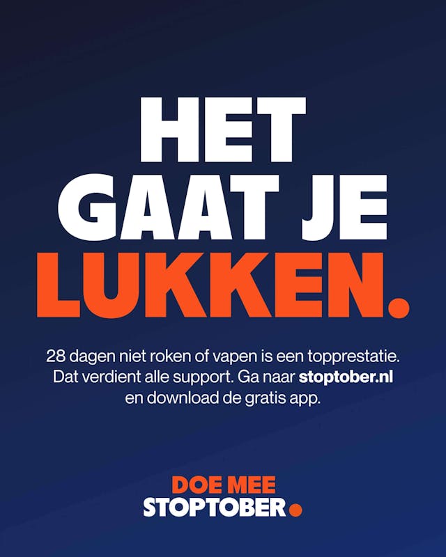 Op 1 oktober 2025 start Stoptober: de landelijke campagne waarin duizenden Nederlanders 28 dagen samen stoppen met roken. Wie 28 dagen niet rookt, heeft vijf keer meer kans om blijvend te stoppen.