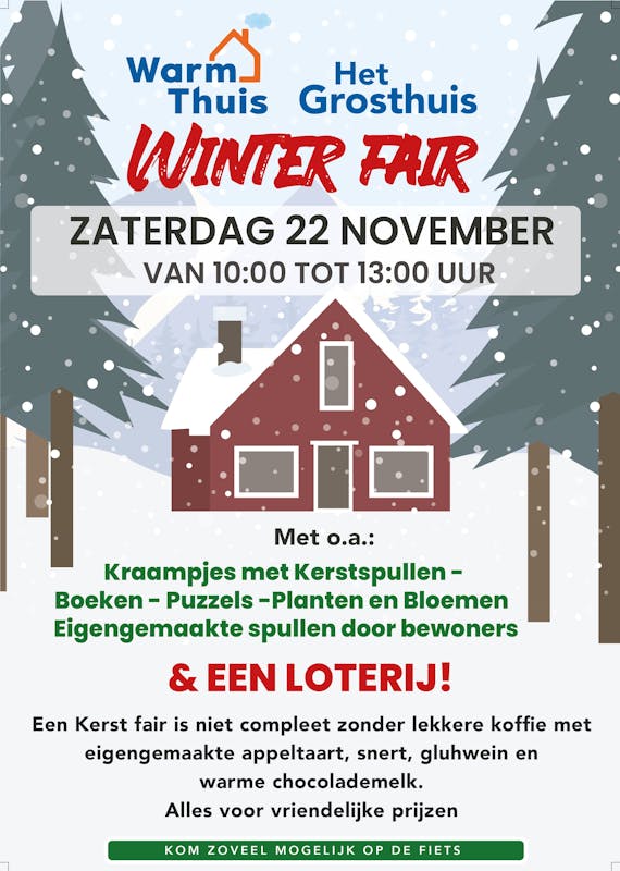 Winterfair poster.pdf Op zaterdag 22 november 2025 is er op locatie Het Grosthuis van WarmThuis een winterfair. Vanaf 10:00u tot 13:00u zijn er op locatie diverse kraampjes m...
