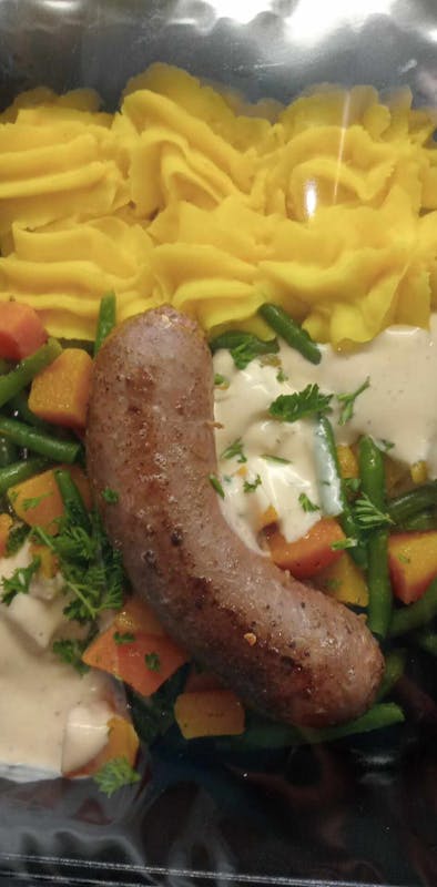 Vlees: Merguez-worstje met groenten, aardappelpuree en pepersaus