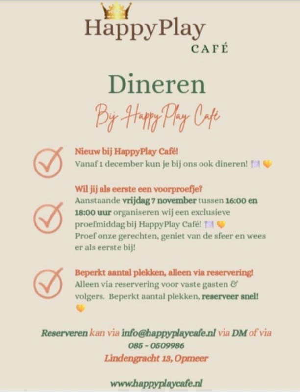 In augustus jl. opende HappyPlay Café haar deuren in Opmeer. Dè plek waar vele ouders, moeders, vaders, opa's en oma's naar verlangden; een geweldige combinatie van "voor de kids" en "voor de volwassenen". Vanuit precies dàt idee is deze plek bedacht. Hier zit je zelf heerlijk te genieten van ontbijt, lunch, snacks, koffie en drankjes die naast heel lekker vaak òok nog gezond zijn terwijl de kinderen spelen en zich vermaken, zij snacken en drinken van hun eigen menu. Ook voor hen is vooral gedacht aan gezondere opties op de kaart! Vier hier feestjes, verjaardagen en babyshowers of kom naar de bak-en-knutselmiddagen en ontmoet anderen groot en klein...je bent hier welkom mèt en zonder kids.