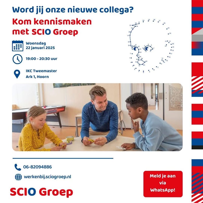 Kom dan vrijblijvend kennismaken met SCIO Groep. Op woensdag 22 januari 2025 houden wij een kennismakingsavond. Je bent welkom op IKC Tweemaster tussen 19.00 - 20.30 uur!