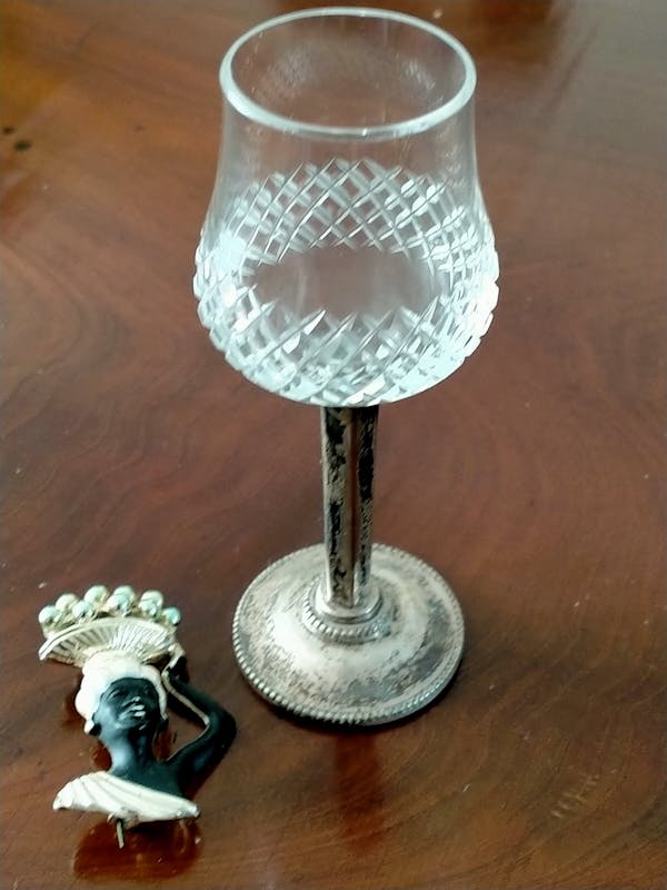 Uit de boedel van mijn oma heb ik slechts een likeurglaasje op zilveren voet gekregen, direct uit de pronkkast. Die kast heeft ook in mijn ouderlijk huis gestaan. De glaasjes passen in de tijdgeest van mijn oma. Samen met de parelmoeren doosjes, de zilveren taartschep en gebak vorkjes en alle andere pronk moet het een bekroning zijn geweest op haar harde werken. En het zuinige, spaarzame leven niet te vergeten. Met wie oma haar rijkdom gedeeld heeft, is niet bekend. Jammer genoeg zijn de verhalen niet doorgegeven. Gelukkig heb ik een toverhoofd, dat de verhalen er zelf wel bij verzint.