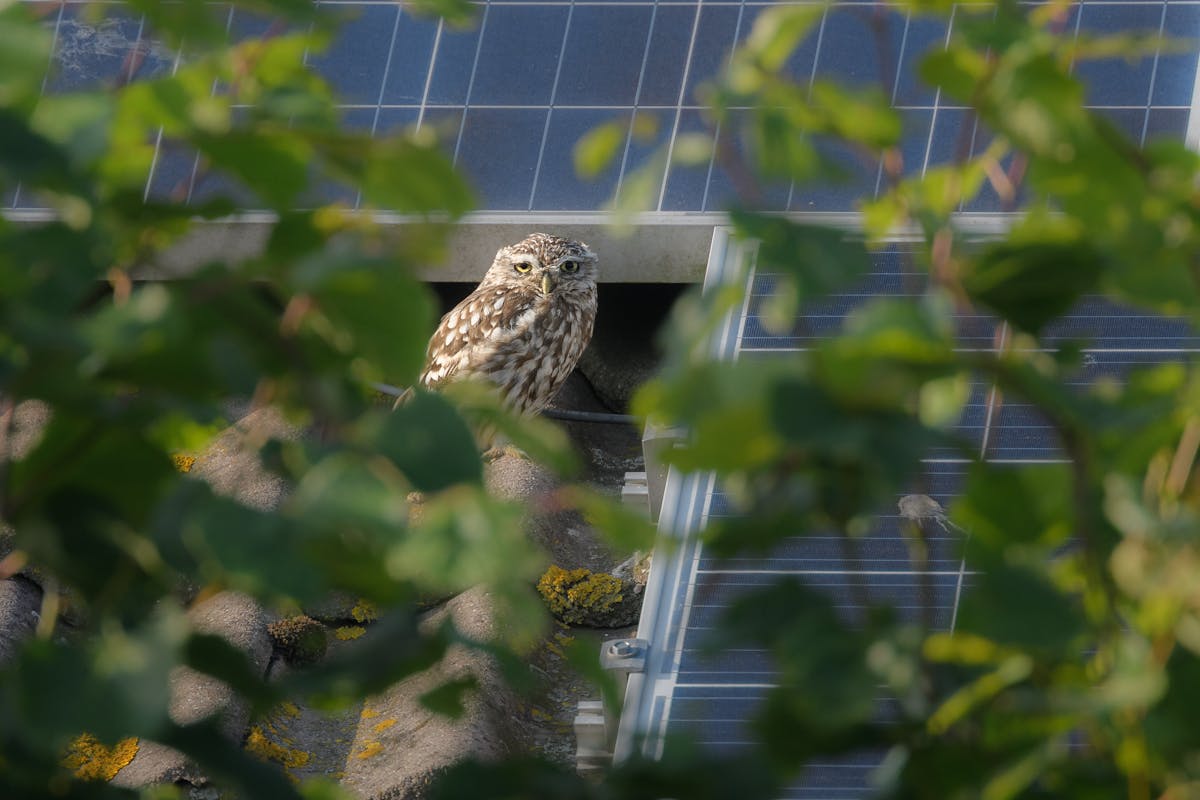 Als ik rondom het dorp fiets, kijk ik in elke knotwilg, op elk vervallen schuurtje en bij iedere boerderij. Ook vraag ik regelmatig aan mensen die op de ruimte wonen of ze weleens een Steenuiltje zien. Want die kan je nog weleens overdag zien, net zoals een Ransuil natuurlijk. Maar ik zie ze zelden of nooit, maar het verlangen blijft. In 2012 zag er een op een mooi met mos begroeit dak ergens bij Aartswoud. In 2023 hoorde ik tijdens een rondje fietsen een Steenuil schreeuwen en ik besloot daar regelmatig te gaan kijken. Het resultaat was een Steenuil tussen de zonnepanelen. Leuk om te zien, maar de plek is natuurlijk lelijk.