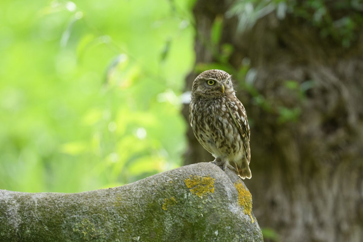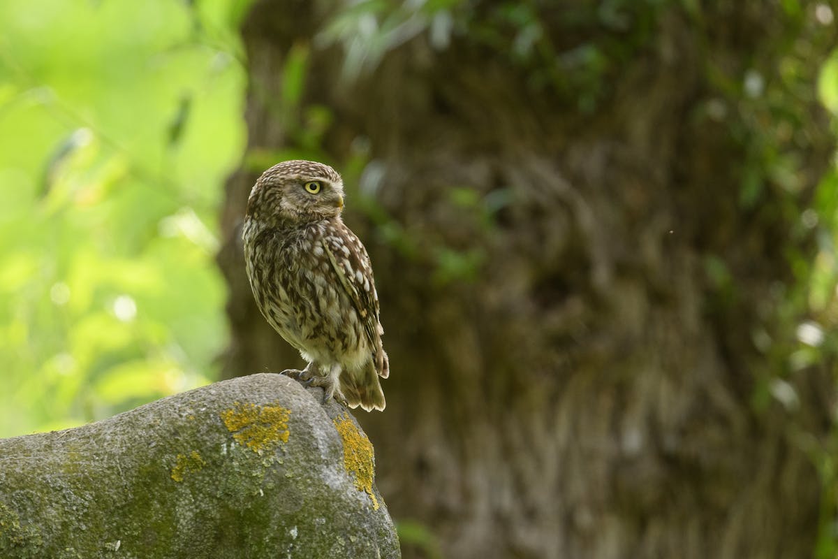 Om half elf kwam het uiltje vanuit een boom op een stenen beeld zitten en kon ik een paar foto's maken. S. keek vanuit het keukenraam en was ook helemaal blij dat het gelukt was.