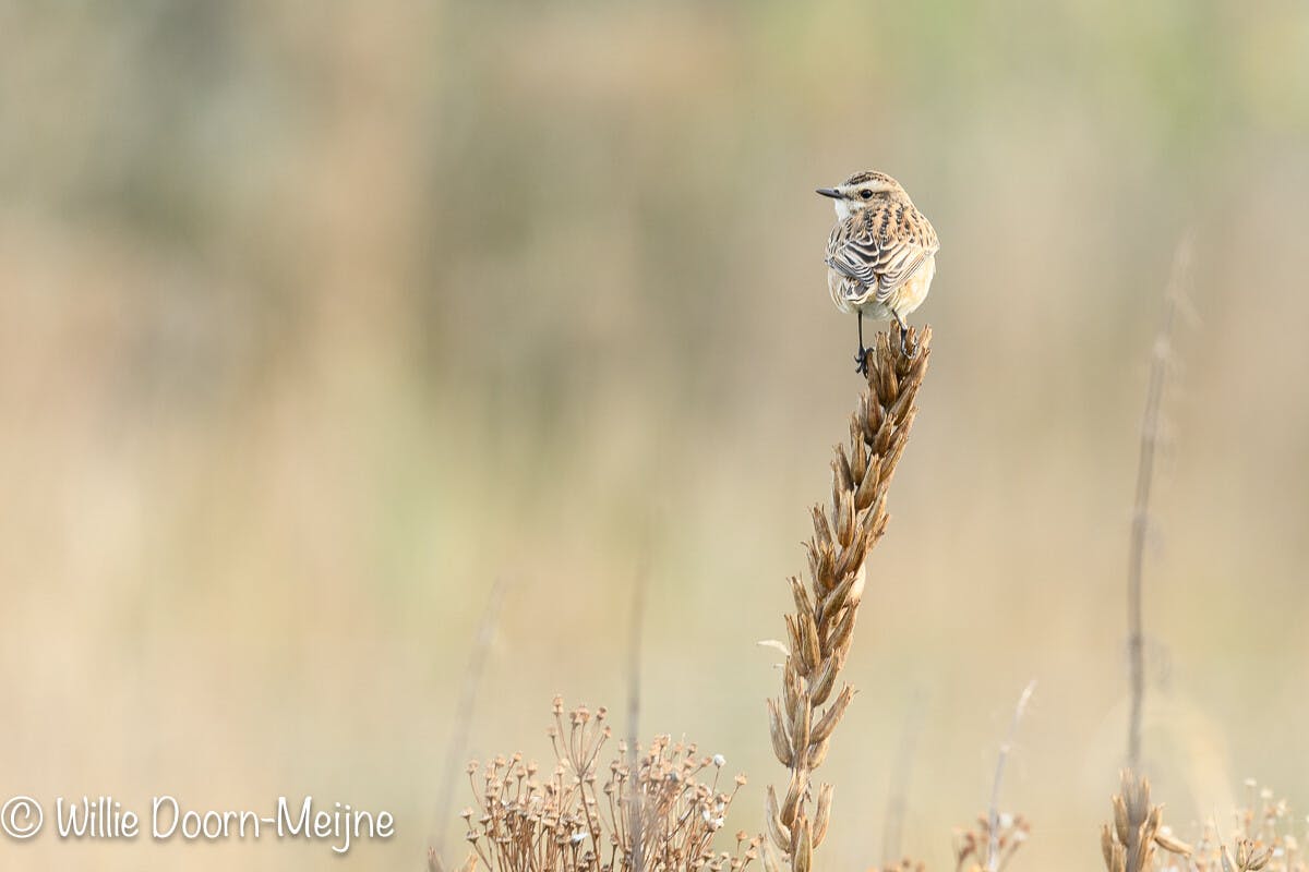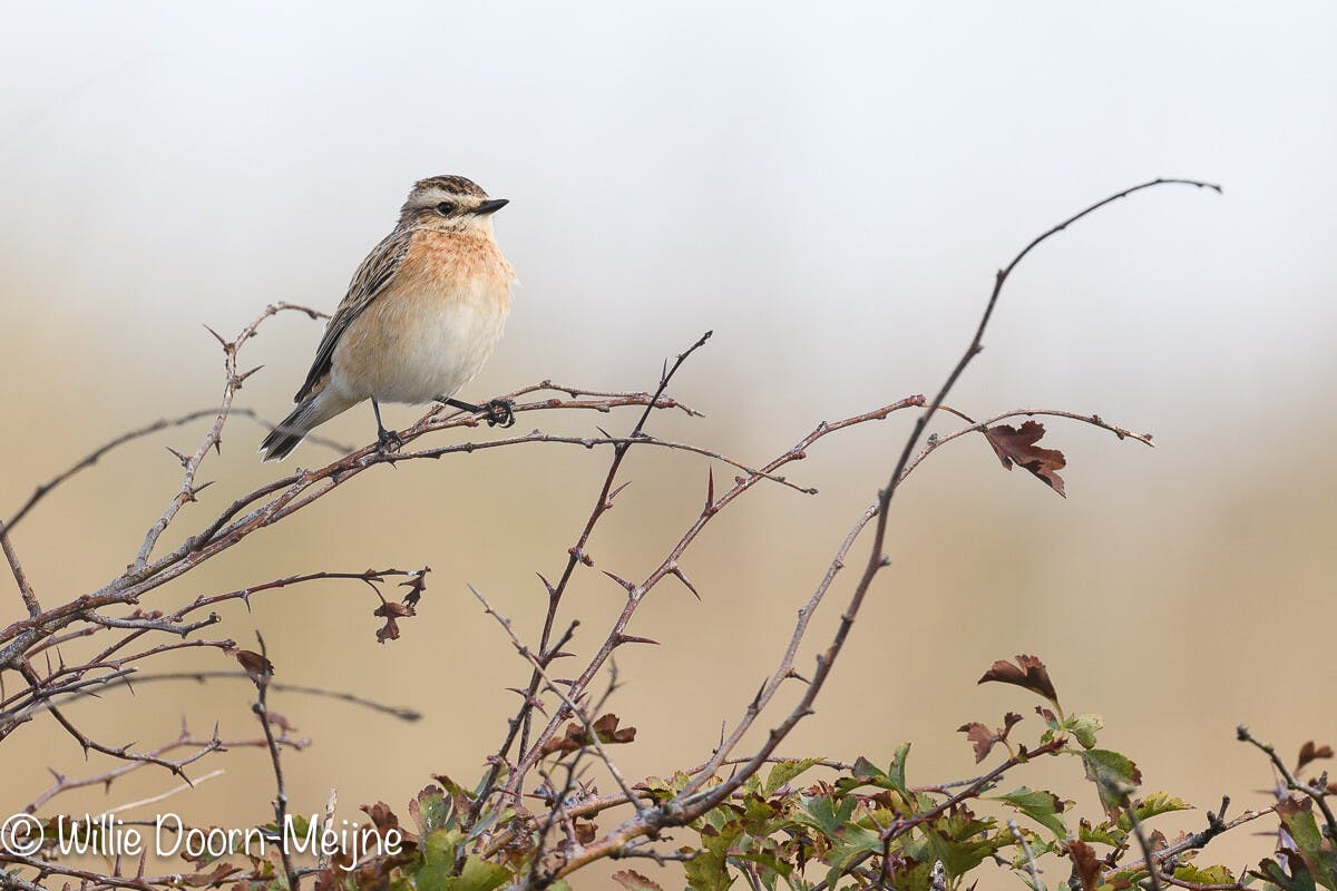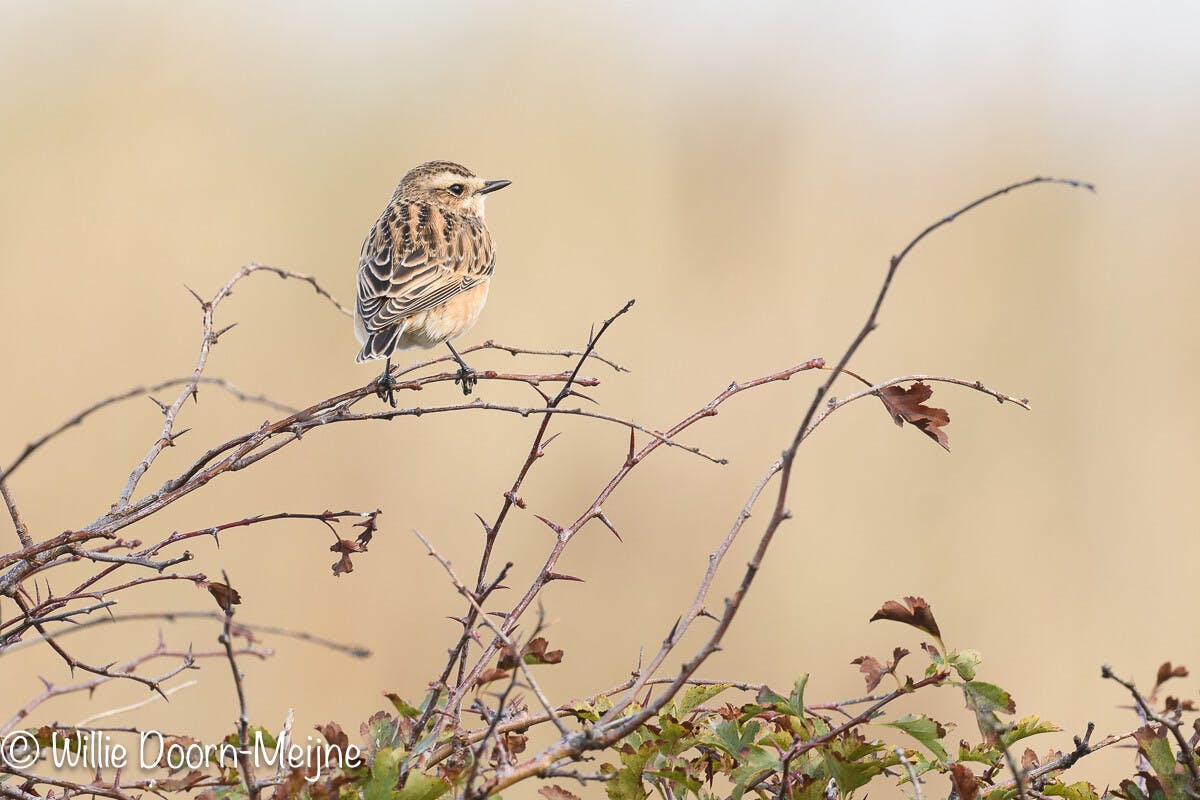 Op een maandagmorgen besloot ik vroeg naar de duinen te rijden met de vouwfiets achter in de auto. Om acht uur stond ik op een parkeerplaats aan de rand van het duin. De fiets uit elkaar geklapt, rugzak op en rijden maar. Vriendinnen van me zeggen weleens 'dat je dat durft zo alleen'. Maar alleen zie je veel meer en vliegen de vogels minder snel weg. Op een enkel buitje na was het weer goed en begon het genieten voor me. Ik scande met mijn ogen de omgeving en na een poosje op een zijweg van de Oldenborghweg richting het strand zag ik wat vliegen. Mijn fietsje neergezet en daarbij zittend zag ik dat het Roodborsttapuiten waren. Nou, dat vond ik al erg leuk, ik had bij mezelf bedacht dat ik al blij met een Roodborstje zou zijn! Ik besloot een tijdje op die plek te blijven en dat was een heel goede beslissing.