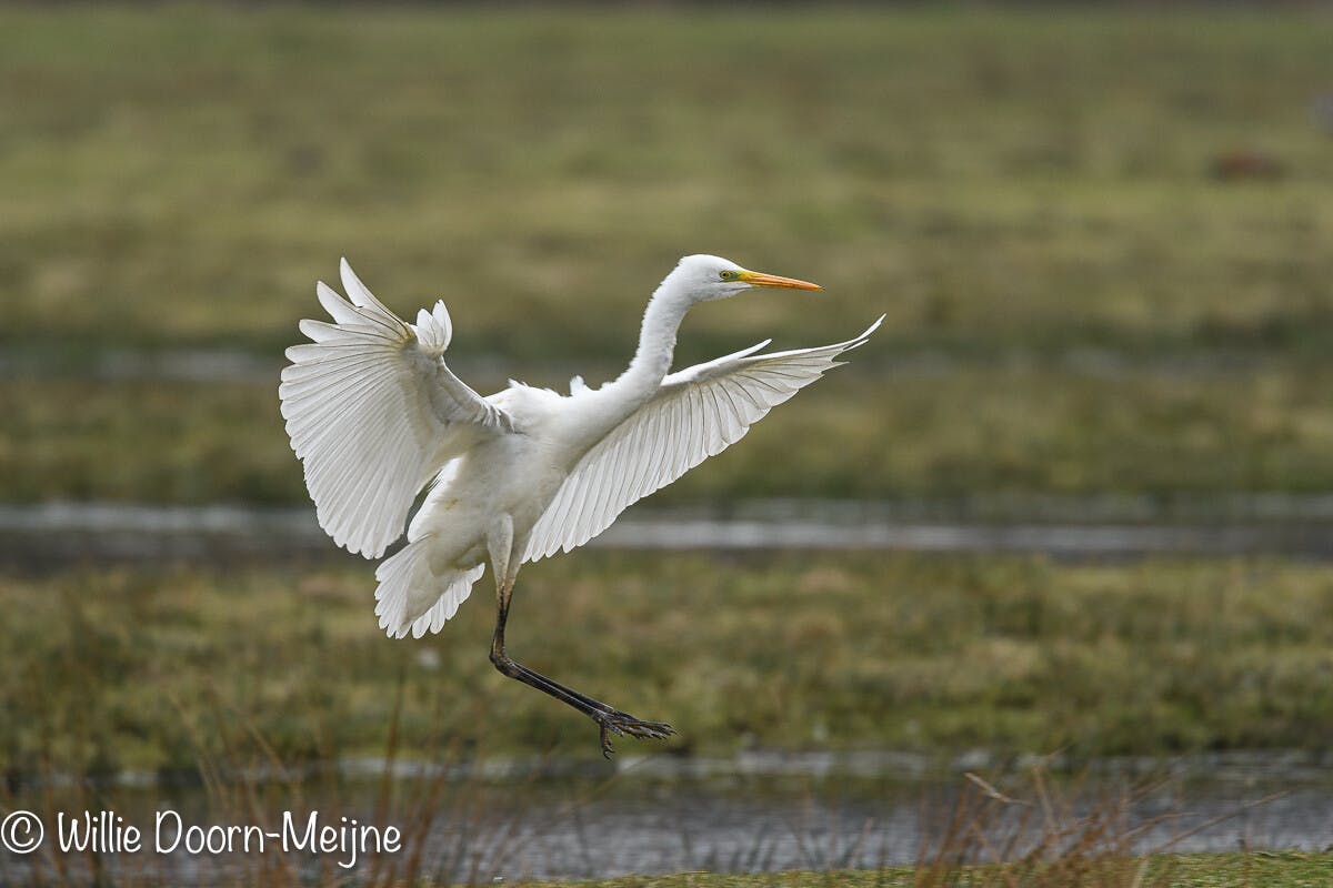 Maar genoeg gezeur, die bewuste ochtend stond er een Grote Zilverreiger in een van de plasjes en tussen de grassen door kon ik een mooie foto maken.