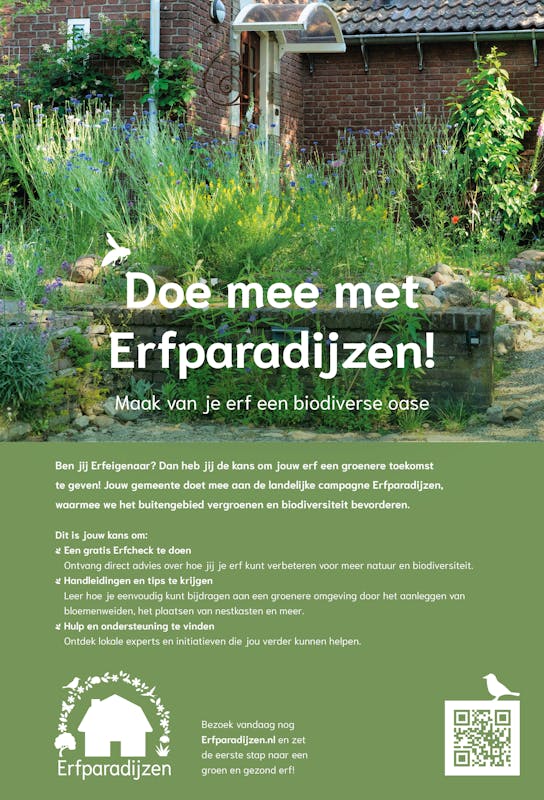 Droom jij van een gezellig erf met ruimte voor planten en dieren, waar je volop geniet van een groene oase? Op de website Erfparadijzen.nl kun je allerlei tips vinden om jouw erf groener, mooier en duurzamer te maken. Ook bieden zij informatie over subsidieregelingen in de regio, kun je een gratis erfscancheck doen en handige handleidingen vinden om je erf aan te pakken.