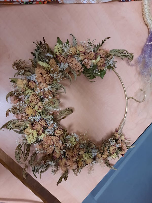 Daarnaast had iemand prachtige kransen van droogbloemen gemaakt. En de kinderen en gastvrouwen zagen er allemaal even mooi uit. Veel traditionele borduursels.
