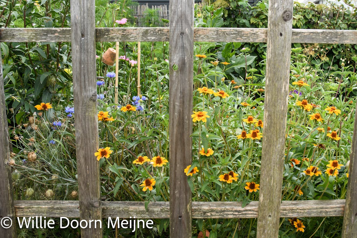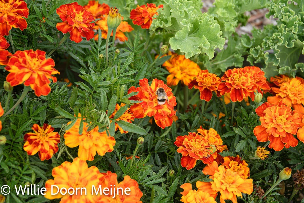 En zo rommel ik maar wat aan, alles staat een beetje door elkaar, wat bloemen hier, een boerenkooltje daar, wat pluksla en een rijtje spinazie en overal gelardeerd met Dille, Tagetes en goudsbloemen.