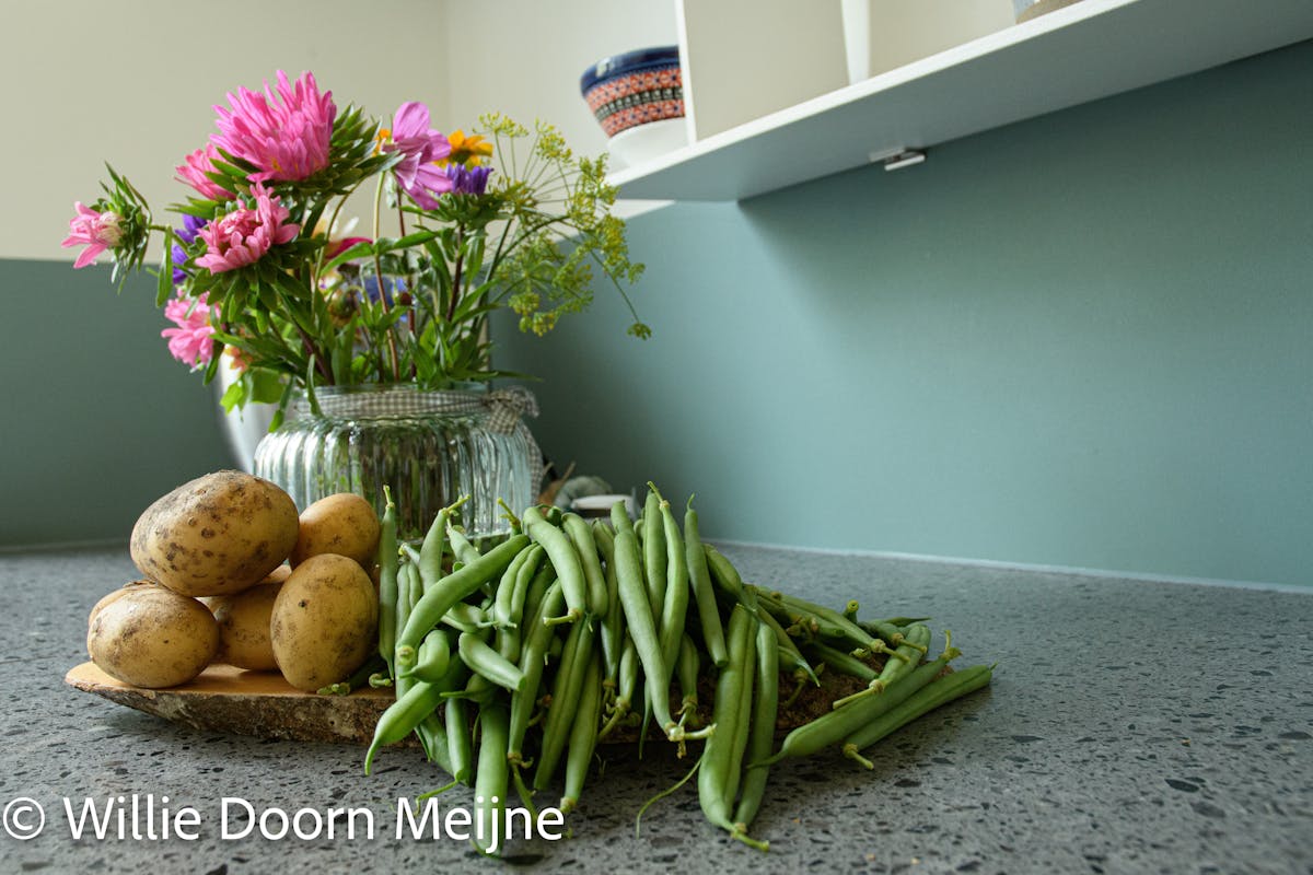De slabonen en snijbonen zijn heerlijk van smaak. Ik heb rode en gele bietjes gezaaid, de gele zijn ook heel smakelijk, die eet ik koud met wat dressing en geitenkaas erover. Elke dag pluk ik wel bloemen, vooral de asters doen het goed. De Cosmea heeft meer groen dan bloem maar misschien komt de bloei wat later?