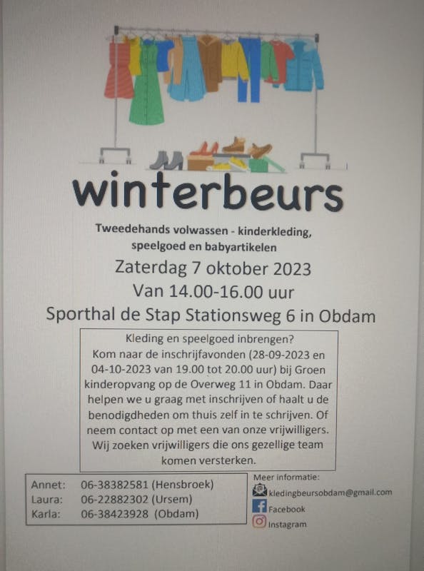 Komt u op zaterdag 7 oktober ook naar de Winterkleding- en speelgoedbeurs in Obdam? Op de beurs vindt u een groot aanbod van baby-kinder-dames-herenkleding in alle soorten en maten, evenals schoenen, boeken, speelgoed en grote babyartikelen, zoals kinderwagen, autostoeltje, logeerbedje, etc….