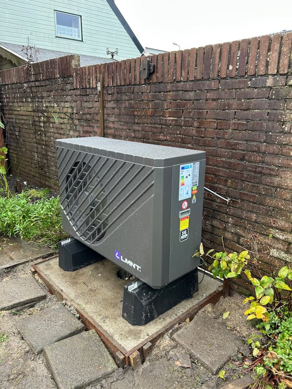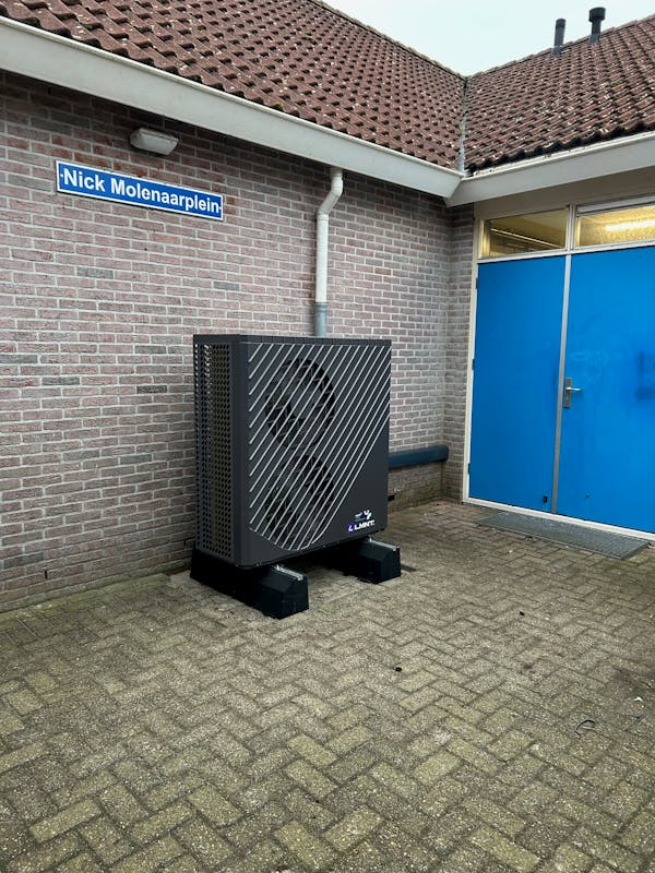 De 5kW York lucht-water warmtepomp als hybride oplossing, deze wordt aangesloten en werkt samen met de CV ketel. Gemiddeld gezien verwarmd de warmtepomp 90% van het stookseizoe...